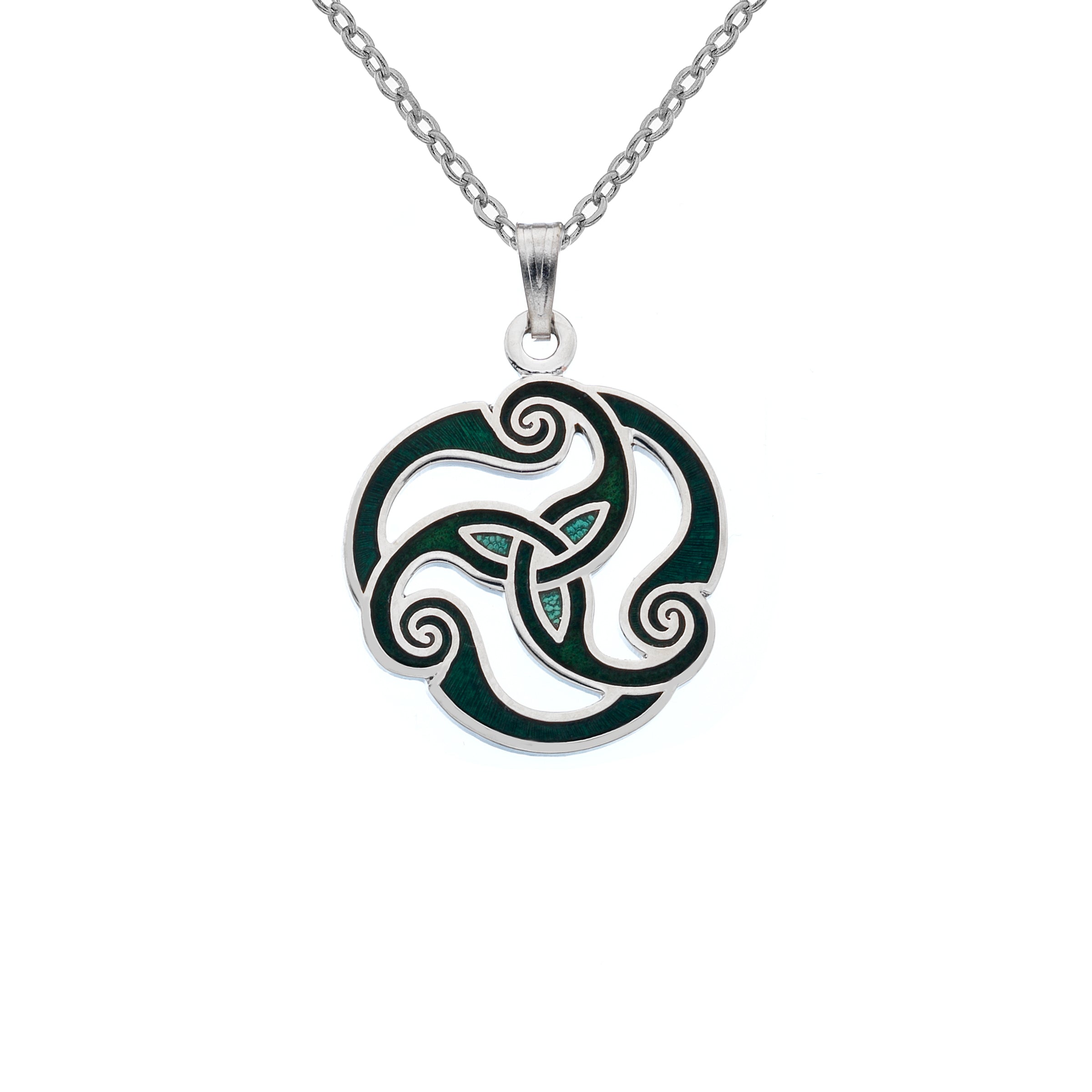 Celtic Lands handcrafted fine vitreous glass enamel necklace. The Triskele symbol features three spirals, representing the cycles of life, and is found in ancient Celtic artwork. Designed in Cornwall, UK. Each piece is fired to 760°C. Includes 18” (45cm) chain and branded gift box.