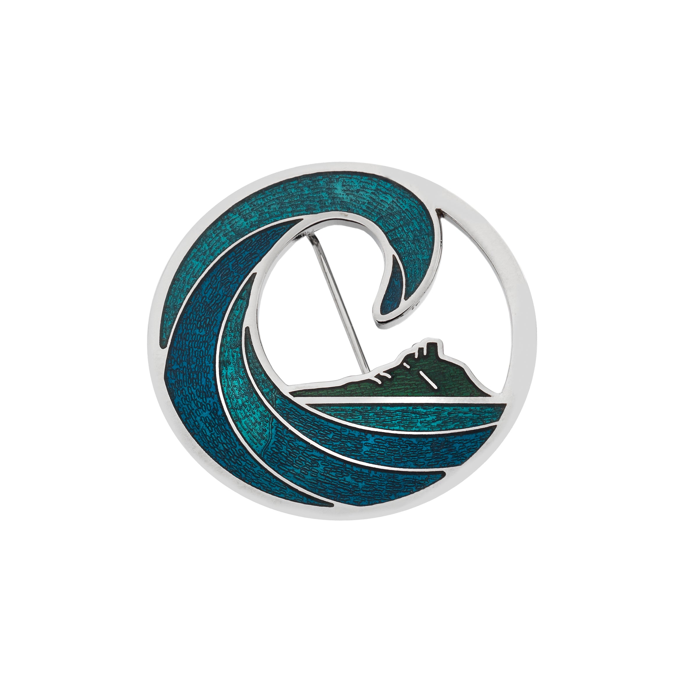 Inspired by the movement and power of the Cornish sea, the wave’s sweeping curl perfectly frames the striking mount in the background. Finished with fine vitreous enamel, the deep blue and teal tones reflecting the ever-changing colours of the sea. A beautiful piece for sea lovers, surfers, and those who carry the Cornwall close to their heart. Branded gift box included.